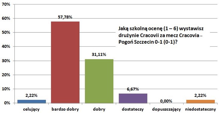 Blisko 60 procent uczestników naszej sondy oceniło grę Cracovii w przegranym 0:1 meczu z Pogonią Szczecin na szkolną „piątkę”.