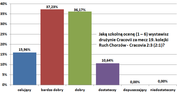 Ponad 74 procent uczestników naszej sondy na fb.com/terazpasy wystawiło Cracovii oceny bardzo dobre lub dobre za wygrany 3:2 (1:2) mecz z Ruchem w Chorzowie. Najczęściej wystawianą oceną (37%) była ocena bardzo dobra. Średnia ze wszystkich ocen wyniosła 4,58.